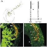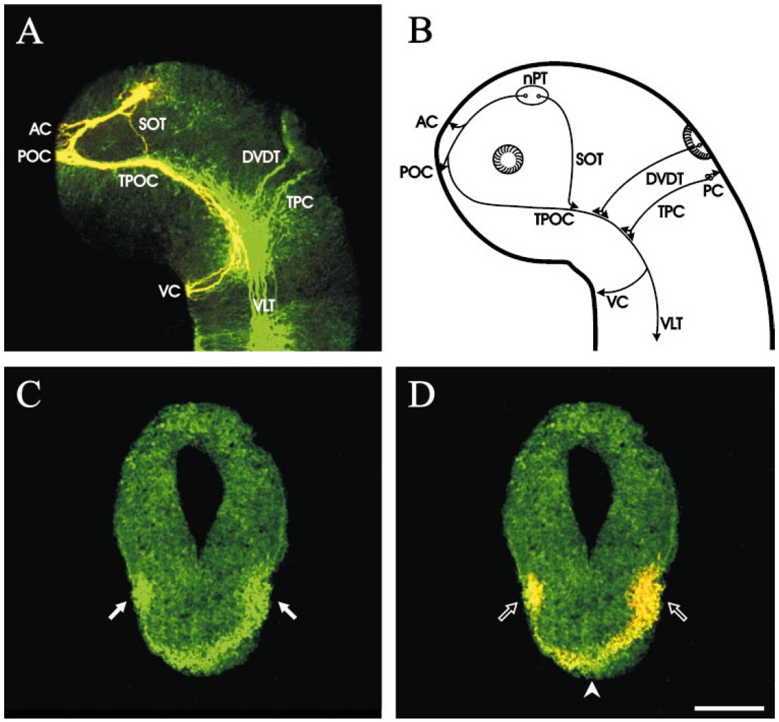 commissure. (B) Schematic representation of the trajectory of axons in the principal axon tracts in the Xenopus brain. (C) Cross section of