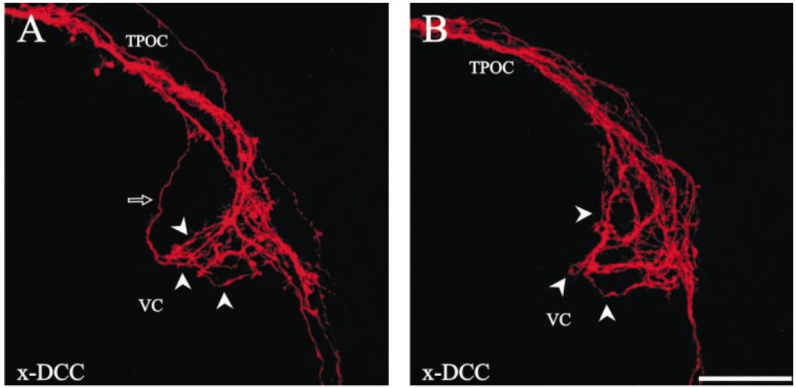 the rostral Xenopus brain at the level of the ventral commissure labeled for DCC. Strong staining was observed in the TPOC (arrows) as