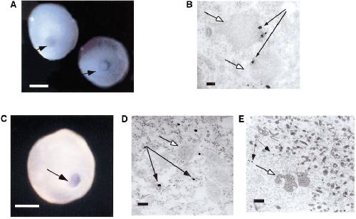 the cloud (A and C) or the silver-enhanced gold particles (B, D, and E). Open arrows point to germinal granules.