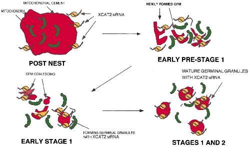 FIG. 5. Summary of germinal granule formation. Xcat2 mRNA was detected at the periphery of the mitochondrial cement (red) in oocytes
