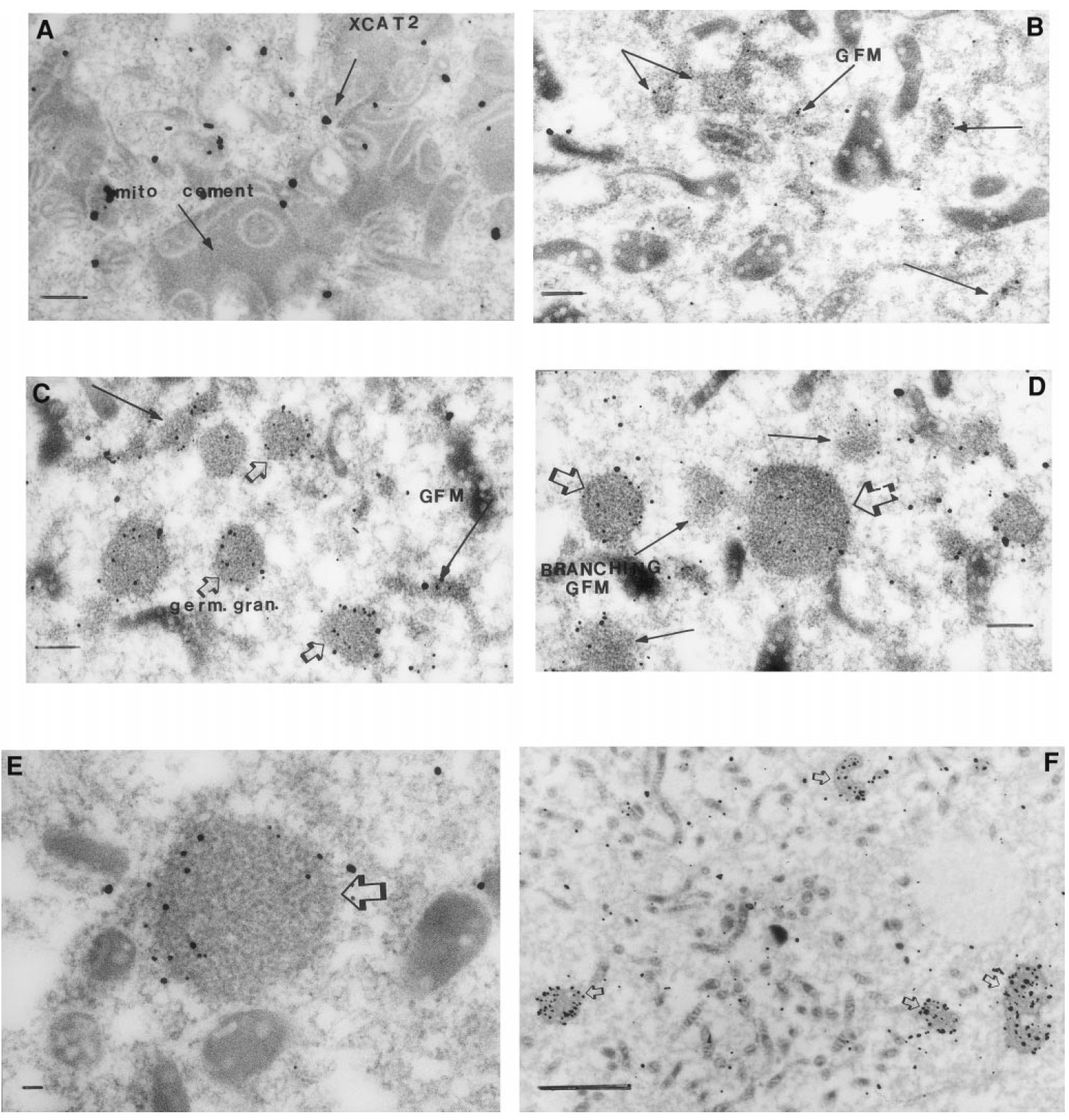 to GFM. Bar, 200 nm. (E) Newly formed germinal granule with Xcat2 at surface. Bar, 50 nm. (F) Low-magnification view of germ plasm