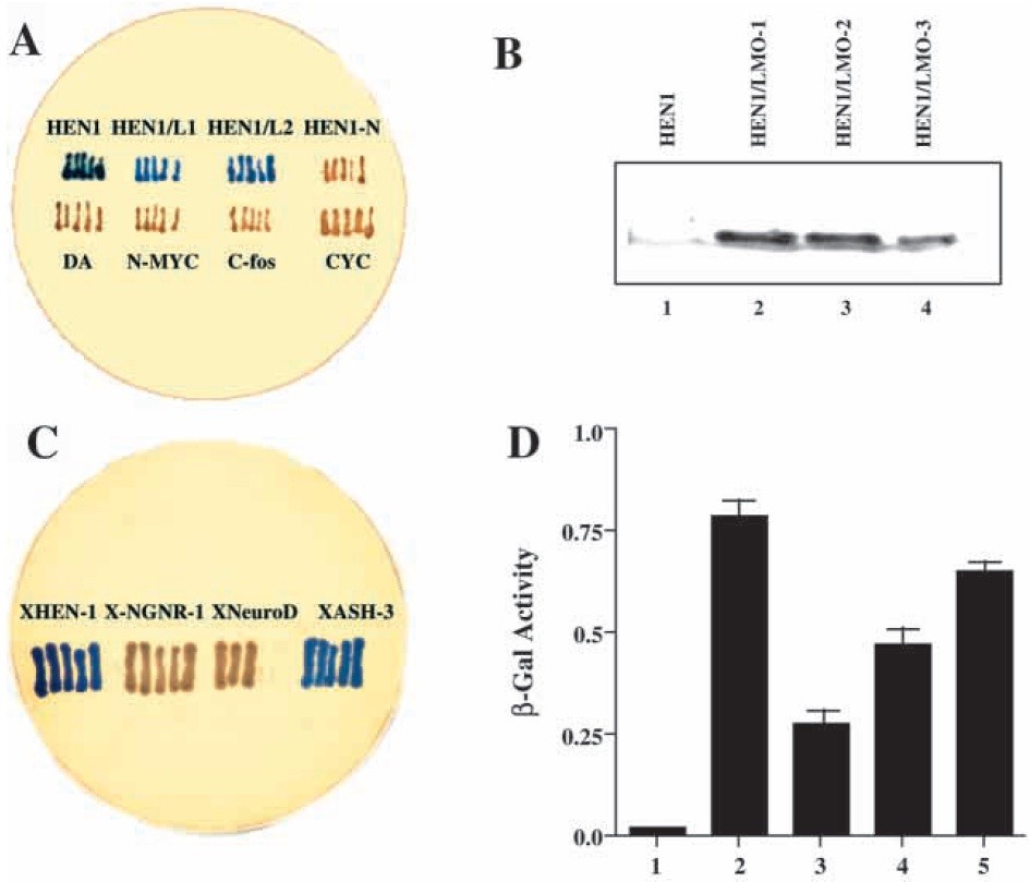 interaction of HEN1 with LMO-1 in yeast. The full-length LMO-1, or only one of