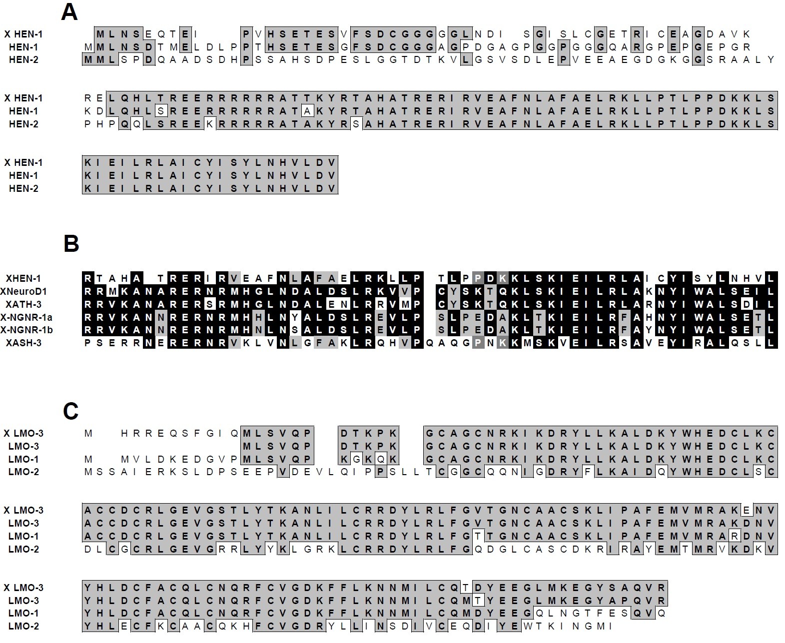 (C) Alignment of the entire predicted amino acid sequences of Xenopus XLMO-3 and human LMO-1, LMO-2, LMO-3. Grey boxes indicate