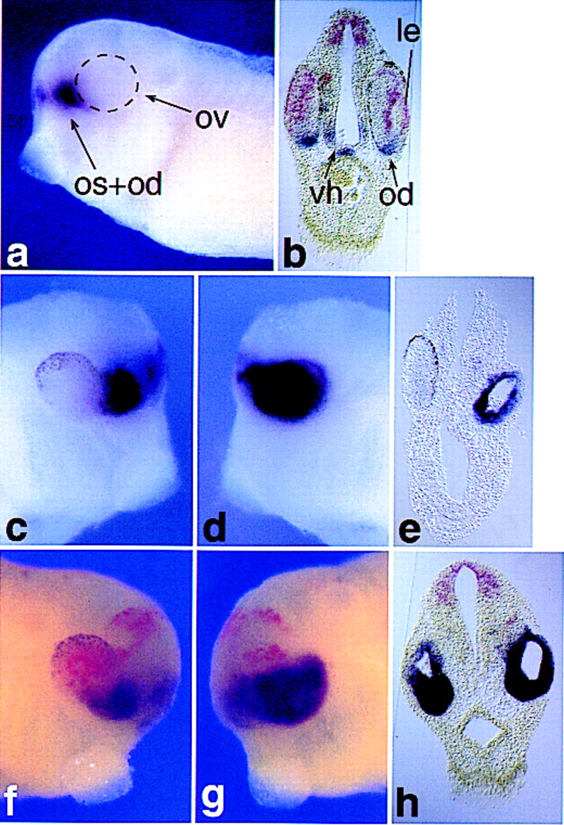 Xvax1 expression is positively regulated byX-bhh. Xenopus embryos were injected into one cell (câg) or into both cells (h) at the two-cell stage with synthetic mRNA encoding X-bhh. (a) Control embryos (stage 34) express Xvax1 in the optic stalk and disc, as well as in the ventralforebrain. (b) Transverse section from a stage 34 control embryo at the level of the eye define differentially regulated Xvax1 (purple) andXpax6 (red) expression domains. Xvax1 is expressed in the ventralhypothalamus and in the eye disc, whereas Xpax6 is strongly expressed in the neural retina and in the lens, as well as in the dorsal midbrain. (câh) Injection ofX-bhh leads to a strong induction of Xvax1 (purple) expression (d,e,g,h) and to a severe inhibition of Xpax6 (red) expression (g,h) in the optic primordium. (c) Uninjected side of the embryo shown in d. (e) Transverse section of the embryo in c and d.Xvax1 (purple) is ectopically expressed in the whole remaining eye vesicle. (f) The uninjected side of the same embryo ing reveals almost normal Xpax6 expression (red) in the eye. (h) Transverse section of an embryo injected into both cells at the two-cell stage. Xvax1 is strongly expressed in both eye vesicles. (le) Lens; (od) optic disc; (os) optic stalk; (ov) optic vesicle; (vh) ventralhypothalamus.