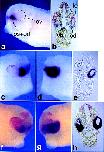 Effect of ectopic Xvax1 overexpression on the transcription of Xrx. Normal expression pattern ofXrx at stages 17 (a) and stage 34 (g). A horizontal vibratome section of a stage 17 embryo is shown ind (anterior is up). Embryos were injected with 250 pg (b,e,h) or 500 pg [c,d(is),f,i] of Xvax1encoding mRNA into both blastomeres at the two-cell stage. The resulting effects were dose dependent. At stage 17, repression ofXrx is either moderate (b,e) or strong [c,d(is),f], resulting in a mild (h) or strong phenotype (i) at stage 34. (nis) Noninjected side; (is) injected side.