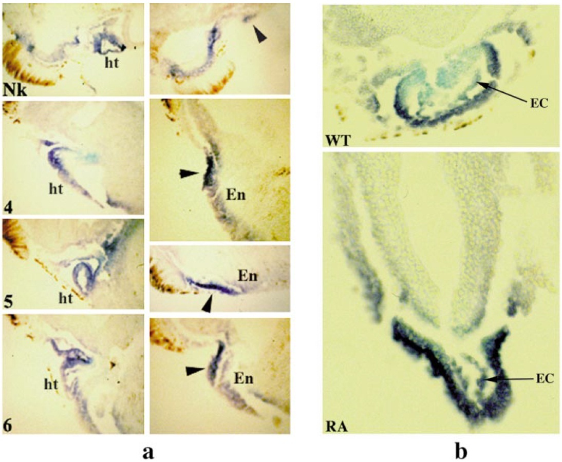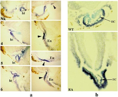 Nkx2.5 RNA are not observed generally in pharyngeal endoderm of RA-treated embryos (Drysdale et al., 1997). (b) An example of an