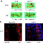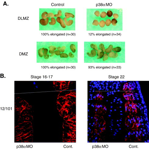 Fig. 3. Inhibition of p38 reduces convergent extension of presomitic mesoderm. (A) Embryos were injected with p38α MO. DLMZ and DMZ explants were dissected at stage 10.25 and cultured until sibling embryos reached early neurula stages. (B) Longitudinal sections of embryos (n = 5) at stages 16 and 22, injected with p38α MO in one blastomere at the two-cell stage, were immunostained, using the 12/101 antibody and viewed by confocal microscopy. Red staining represents presomitic and somitic mesoderm (12/101) and blue represents nuclei staining (TO-PRO3 iodide). Results shown are from one embryo. Similar results were obtained with all five embryos.