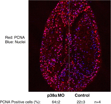 Fig. 4. Inhibition of p38 prevents cell cycle arrest in the presomitic mesoderm. Two-cell embryos were injected unilaterally into one blastomere with p38α MO (7.5 ng). Embryos were cultured until late gastrula-early neurula stages, then fixed and longitudinally-sectioned. Proliferation cell nuclear antigen (PCNA) antibody was used to detect nuclei of proliferating cells (red staining). Nuclear counterstaining was done with TO-PRO3 iodide (blue staining). Section of one embryo is shown. Similar results were obtained with all other embryos (n = 4). Statistical analysis from the four embryos is presented.
