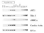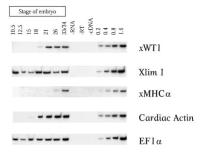 from 20 to 12.5. Expression of Xlim-1 is absent from stage 29. At this stage, it is possible to remove the developing pronephric tubules and duct before explanting the glomus. The absence of Xlim-1 transcripts therefore confirms that this dissection was performed accurately. Explants excised from stage 11 or 12 embryos did not express Xlim-1. This data concur with previous data that showed pronephric tubules are specified at stage 12. 5 (Brennan et al., 1998). Cardiac actin is expressed in explants removed at stages 11 and 12, thus proving that these ectodermal wraps did contain viable mesodermal tissue including somitetissue. The absence of xWT 1 expression in explants removed at these stages is not therefore due to the lack of viable explant within the ectodermal wraps, but to the absence of specified glomustissue. A no insert control was included consisting only of the ectodermal wrap. This sample was negative for all markers with the exception of EF-1α which is present within the animal caps that are used in the ectodermal wraps. Stage 33/34 embryos were used as a positive control. Other controls are as detailed for Fig. 2 above. For each sample, total RNA was extracted from 10 ectodermal wraps (or 2 control embryos) and subjected to RT-PCR analysis as detailed in the Materials and Methods above.