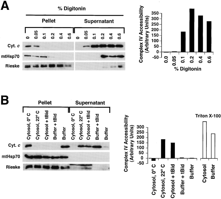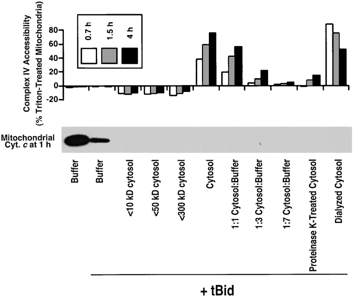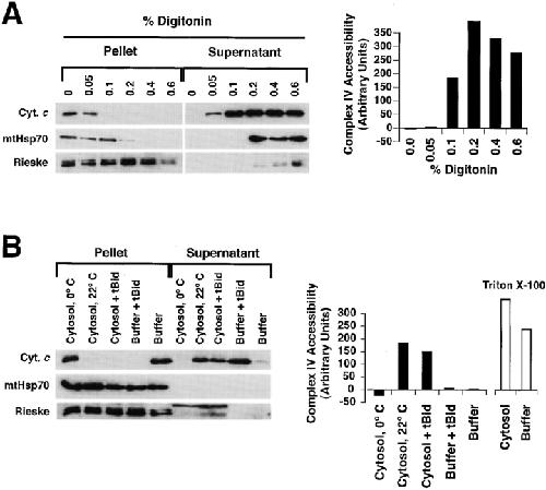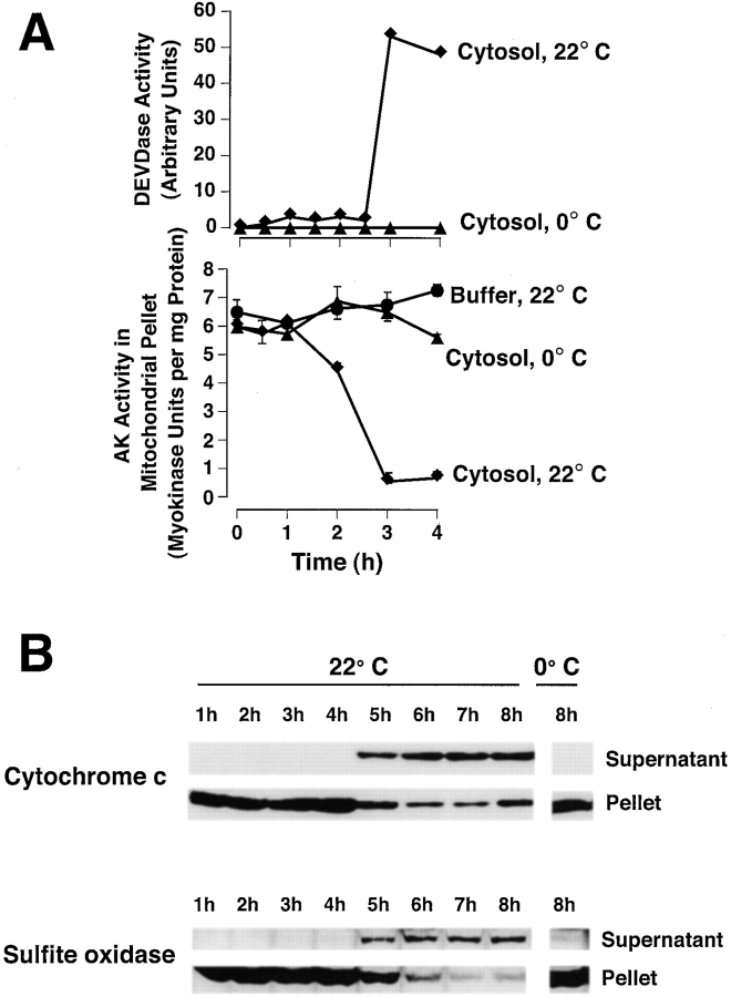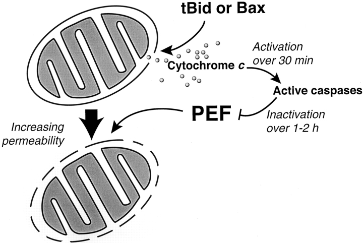 During apoptosis, an important pathway leading to caspase activation involves the release of cytochrome c from the intermembrane space of mitochondria. Using a cell-free system based on Xenopus egg extracts, we examined changes in the outer mitochondrial membrane accompanying cytochrome c efflux. The pro-apoptotic proteins, Bid and Bax, as well as factors present in Xenopus egg cytosol, each induced cytochrome c release when incubated with isolated mitochondria. These factors caused a permeabilization of the outer membrane that allowed the corelease of multiple intermembrane space proteins: cytochrome c, adenylate kinase and sulfite oxidase. The efflux process is thus nonspecific. None of the cytochrome c-releasing factors caused detectable mitochondrial swelling, arguing that matrix swelling is not required for outer membrane permeability in this system. Bid and Bax caused complete release of cytochrome c but only a limited permeabilization of the outer membrane, as measured by the accessibility of inner membrane-associated respiratory complexes III and IV to exogenously added cytochrome c. However, outer membrane permeability was strikingly increased by a macromolecular cytosolic factor, termed PEF (permeability enhancing factor). We hypothesize that PEF activity could help determine whether cells can recover from mitochondrial cytochrome c release.
