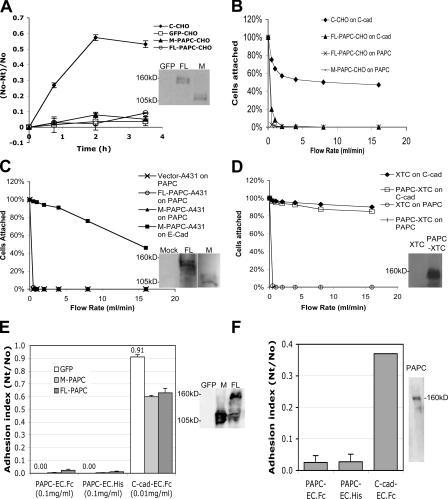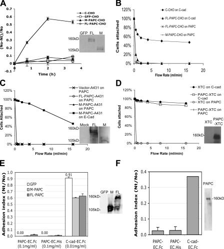 Figure 1. PAPC does not mediate homophilic cell adhesion. (A) Cell aggregation assay of CHO cells stably expressing FL-PAPC (FL-PAPC-CHO), M-PAPC (M-PAPC-CHO), C-cadherin (C-CHO, as positive control), or GFP (GFP-CHO, as negative control). (B) Cell attachment flow assay of stable FL-PAPC-CHO and M-PAPC-CHO cells on PAPC-EC.Fc substrate. Flow assay of C-CHO on C-cad-EC.Fc substrate was performed as positive control, and assay of FL-PAPC-CHO on C-cad-EC.Fc was used as negative control. (C) Cell attachment flow assay of stable FL-PAPC-A431 and M-PAPC-A431 cells on PAPC-EC.Fc substrate. Mock-transfected A431 (Vector-A431) cells were used as negative control, and adhesion of M-PAPC-A431 on human E-cad-EC.Fc was the positive control. (D) Cell attachment flow assay of stable PAPC-expressing XTC cells (PAPC-XTC) and parental XTC cells on PAPC-EC.FC substrate. The adhesion of XTC and PAPC-XTC on C-cadherin (C-cad-EC.Fc) substrate was positive control. (E) Blastomere adhesion assay with animal cap cells that ectopically express GFP, FL-PAPC (FL), or M-PAPC (M). 1.5 ng RNA was injected into embryos. Adhesion substrates were coated with 0.1 mg/ml PAPC-EC.Fc, 0.1 mg/ml PAPC-EC.His, or 10 μg/ml of C-cad-EC.Fc. (F) Blastomere adhesion assay with dorsal trunk mesodermal blastomeres from stage 12 embryos. Adhesion substrates were coated as in E. Expression of PAPC in cells used for adhesion assays was shown by anti-PAPC Western blot on the right of each graph. Error bars are the SEM.