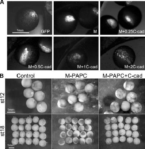 Figure 4. Overexpression of C-cadherin reverts M-PAPC–induced cell sorting and gastrulation defects. (A) Coexpression of C-cadherin reverts M-PAPC–induced cell sorting. Cell dispersal assays were performed by coinjecting different doses of C-cadherin mRNA, along with 300 pg of M-PAPC mRNA and 180 pg of NLS-GFP mRNA, as tracer. As control, 200 pg of NLS-GFP mRNA alone was injected (GFP). The C-cadherin mRNA doses were 0 pg (M), 75 pg (M + 0.25C-cad), 150 pg (M + 0.5C-cad), 300 pg (M + 1C-cad), and 600 pg (M + 2C-cad). (B) Exogenous C-cadherin expression rescues M-PAPC–induced blastopore-closure defects. 1 ng of GFP mRNA (Control), 0.5 ng of M-PAPC mRNA alone (M-PAPC), or 0.5 ng M-PAPC mRNA plus 1 ng of C-cadherin mRNA (M-PAPC + C-cad) were injected at the 4-cell stage into the animal poles of all four blastomeres. At stage 12 (top row), control embryos showed normal, nearly closed blastopores (30/30); M-PAPC mRNA-injected embryos failed to close their blastopores and showed an exogastrula phenotype (0/10 normal); coinjection of C-cadherin mRNA rescued the blastopore-closure defect (30/31 normal). In another experiment, embryos were allowed to develop to stage 18 (bottom row). GFP mRNA-injected embryos appeared normal (20/20), and M-PAPC mRNA-injected embryos failed to close their blastopores and exhibited exogastrula phenotype (0/20 normal), whereas coinjection of C-cadherin mRNA significantly rescued the defect (15/20 normal).