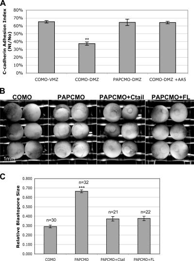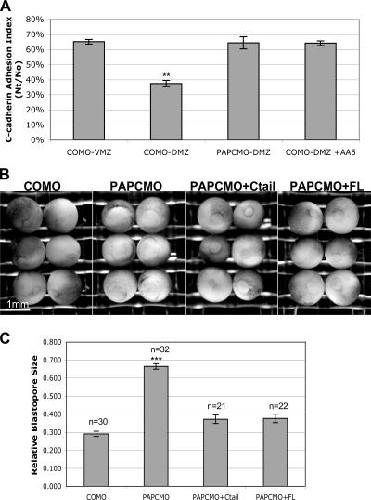 Figure 5. Loss of endogenous PAPC expression results in increased C-cadherin–mediated adhesion in DMZ cells and gastrulation defects that can be rescued by decreased C-cadherin adhesion. (A) Effects of loss of PAPC on C-cadherin–mediated adhesion in DMZ cells. 80 ng of control (COMO) or PAPC morpholinos (PAPCMO) were injected into the DMZ of 4–8–cell stage embryos. At stage 10.5, blastomeres were isolated from the VMZ or DMZ of five COMO- or PAPCMO-injected embryos and then tested for adhesion to purified C-cad-EC.Fc. Half of the blastomeres from the DMZ of control embryos were treated with 1 μg/ml AA5 Fab fragment before adhesion assay. **, P < 0.001 compared with the rest samples. (B and C) Rescue of PAPC morpholino-induced gastrulation defects by DN C-cadherin. 80 ng COMO, PAPCMO, or PAPCMO supplemented with either 25 pg C-cadherin cytoplasmic tail RNA (Ctail) or 50 pg FL-PAPC(-UTR) RNA (FL) was injected into the DMZ of 4-cell stage embryos. At stage 12.5, pictures of six randomly picked embryos from each group of embryos were taken (B). Meanwhile, the relative blastopore size (the ratio of the blastopore diameter versus the embryo diameter) of each injected embryo was measured and graphed (C). Error bars are the SEM. ***, P < 0.0001 compared with the rest groups of embryos. n, the number of embryos in each group.