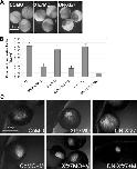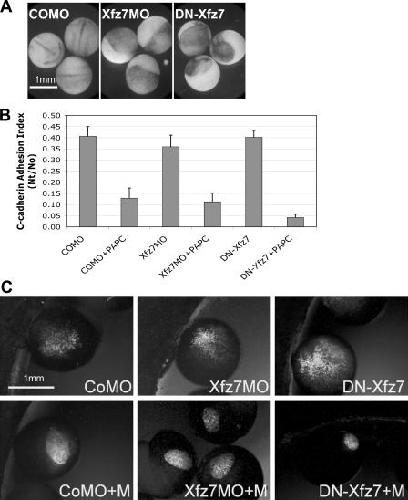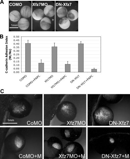 Figure 7. PAPC-regulation of C-cadherin adhesion and cell sorting is independent of Frizzled-7. (A) Frizzled-7 morpholinos (Xfz7MO) and DN Frizzled-7 (DN-Xfz7) cause sever gastrulation defects. 40 ng of control morpholino (COMO), 40 ng of Xfz7MO, or 2.4 ng of DN-Xfz7 mRNA was injected into 2-cell stage embryos, which were allowed to develop to stage 20. (B) PAPC down-regulates C-cadherin activity even in the presence of Xfz7-MO or DN-Xfz7. Embryos were injected as in A. At the 4-cell stage, half of the injected embryos were further injected with 1.2 ng of FL-PAPC mRNA. Blastomere adhesion assays were performed on 4 μg/ml C-cad-EC.Fc–coated substrates. Error bars are the SEM. (C) Xfz7-MO and DN-Xfz7 have no affects on M-PAPC–induced cell sorting. (top row) Cell dispersal assays with 10 ng of COMO, 10 ng of Xfz7MO, or 500 pg of DN-Xfz7mRNA (all with NLS-GFP mRNA as tracer) injected into one blastomere of 32-cell stage embryos. (bottom row) Cell dispersal assays with 40 ng of COMO, 40 ng of Xfz7MO, or 4 ng of DN-Xfz7mRNA injected into 2-cell stage embryos, followed by injection of 500 pg of M-PAPC mRNA plus 200 pg of NLS-GFP mRNA (as tracer) into one blastomere at the 32-cell stage.