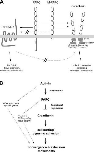 Figure 8. Models for the role of PAPC in activin-induced regulation of C-cadherin adhesion and tissue morphogenesis. (A) Relationship between PAPC, Frizzled-7 signaling, and regulation of C-cadherin–mediated adhesion. The membrane-bound PAPC extracellular domain, as well as wild-type PAPC, down-regulates C-cadherin adhesion activity either directly or indirectly, and the regulation of C-cadherin adhesion activity contributes to convergence and extension cell movements. PAPC also interacts with Xfz7 and participates in the activation of RhoA and JNK by Xfz7-mediated signaling to affect tissue separation and convergent extension. Full-length PAPC is required for Xfz7-mediated tissue separation. (B) A signaling cascade that mediates the activin-induced tissue morphogenesis. The findings from this study are shown in bold. Additional signaling steps shown in other studies to be important for activin-induced morphogenesis are indicated by dotted arrows.