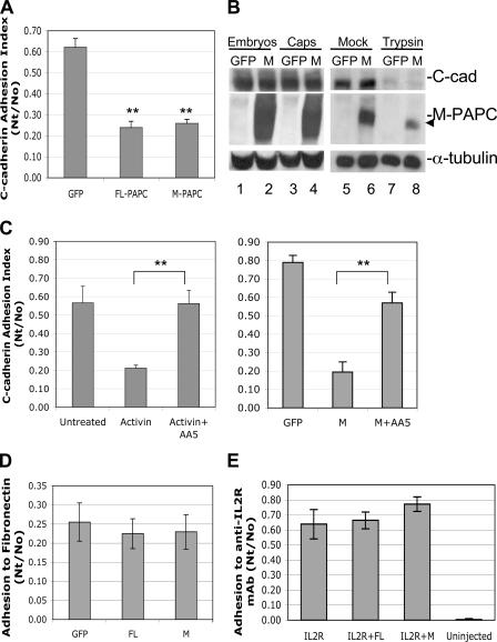 Figure 3. Both FL-PAPC and M-PAPC down-regulate C-cadherin adhesion activity. (A) Blastomere adhesion assay of GFP mRNA- (control), FL-PAPC mRNA-, or M-PAPC mRNA-injected embryos (1.5 ng/embryo) on 4 μg/ml C-cad-EC.Fc–coated substrates. **, P < 0.001 (by t-test) compared with the control GFP-expressing blastomeres. (B) M-PAPC expression does not change either total or cell surface C-cadherin protein levels in blastomeres. Embryos were injected as in A. C-cadherin levels in total embryo lysates (lanes 1–2), stage 9 animal cap explants (lanes 3–4), and dissociated animal cap cells that were either mock treated (lanes 5–6) or trypsin/EDTA treated (lanes 7–8) were determined by Western blotting with anti– C-cadherin mAb (6B6). Expression of M-PAPC was confirmed by anti-PAPC blotting, and anti–α-tubulin blots served as loading control. Arrowhead, a fragment of M-PAPC. (C) C-cadherin–activating antibody AA5 (1 μg/ml Fab fragment) reverts the down-regulation of C-cadherin–mediated adhesion induced by either activin-treatment (left) or M-PAPC expression (right). **, P < 0.01. (D) Blastomere adhesion to fibronectin is not changed by PAPC-expression. (E) Blastomere adhesion to anti-IL2R mAb BB10 is not changed by PAPC-expression. FL, FL-PAPC; M, M-PAPC; IL2R, IL2Rα. Error bars are the SEM.
