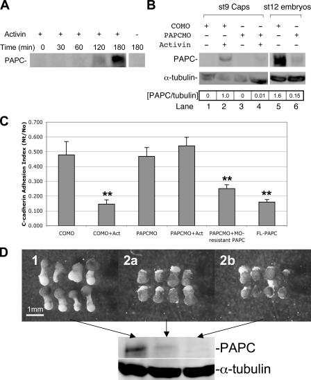 Figure 6. Requirement for PAPC in the activin-induced regulation of C-cadherin adhesion activity and animal cap morphogenesis. (A) Activin induces PAPC protein expression in animal cap explants. Stage 8 animal caps were treated with 5 ng/ml activin for 0, 30, 60, 120, and 180 min and immediately processed for anti-PAPC Western blot analysis. (B) PAPC morpholinos (PAPCMO) suppress activin-induced PAPC expression and endogenous PAPC expression. Lanes 1–4: stage 9 animal caps analyzed by anti-PAPC Western blotting. 80 ng COMO or PAPCMO were injected into the animal hemisphere at the 2–4–cell stage, and animal caps were excised, dissociated, and treated with or without 5 ng/ml activin for 1.5 h. Lanes 5–6: whole embryos analyzed by anti-PAPC Western blotting. 80 ng of COMO or PAPCMO were injected into the dorsal side at the 4-cell stage, and incubated to stage 12. The level of PAPC was normalized to the level of α-tubulin. (C) PAPCMO block activin-induced down-regulation of C-cadherin activity. Blastomere adhesion assays on 4 μg/ml C-cad-EC.Fc–coated substrates were performed with the blastomeres described in B (lanes 1–4). In addition, blastomeres from embryos injected with PAPCMO plus morpholino-resistant FL-PAPC mRNA or with FL-PAPC mRNA alone were also assayed in parallel. **, P < 0.01 compared with COMO-injected, untreated blastomeres. Error bars are the SEM. (D) PAPCMO blocked activin-induced animal cap elongation. 80 ng of COMO or PAPCMO were injected into the animal hemisphere of 2–4 cell stage embryos. (1) The control COMO-injected caps fully elongated (30/30). The PAPCMO-injected caps were divided into two groups according to their phenotypes: (2a) partial elongation (12/30) and (2b) no elongation (18/30). Five caps from each of the groups were processed for Western blot analyses with anti-PAPC and anti–α-tubulin antibodies.