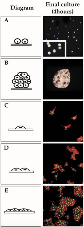 Fig. 1. Configurations of cell culture. Cells from stage 8.5-9 animal caps are dissociated, incubated in activin at the required concentration and washed, as described by Dyson and Gurdon (1998). The two substrates used are 1% agarose or fibronectin (see Materials and Methods). In all cases the MBS culture medium contains Ca2+, Mg2+ and 0.1% bovine serum albumin. (A) Single cells on agarose are distributed sparsely so that, initially, nearly all cells are present as single cells or as sister pairs (inset). After culture, each cell or sister-pair has formed well separated clonal groups of 2, 4 or 8 cells or, more often, has remained as a single cell. (B) To form reaggregates, several thousand cells are centrifuged into a pellet, which is then transferred to an agarose substrate. (C-E) Cells are distributed at low (C), medium (D) or high density (E) on to a fibronectin substrate to which they attach. The righthand column for Figs C-E show cells stained with rhodamine-phalloidin and TOTO-3 (see Methods). At the equivalent of stage 10.5, cells are frozen or fixed.