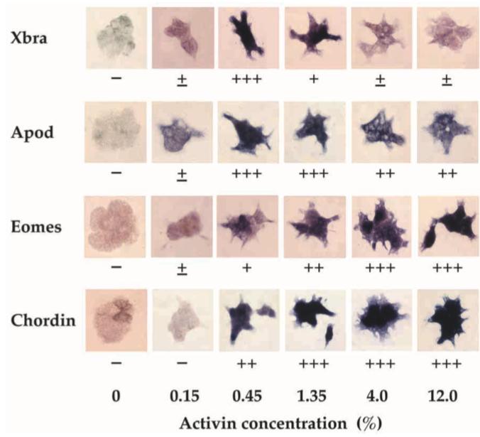(as in Fig. 1C) were in situ-hybridized to the probes stated (Xbra, Xapod, Xeomes and Xchordin). The colour reaction is BM purple. Each figure shows a representative clonal colony of 1-4 cells, fixed at stage 10.5. The + or â values under each figure are based on densitometry readings (see Materials and Methods). â, background value; ±, density value 2; +, ++, +++, density values 3, 4 and 5 or more respectively (see Fig. 6). Altogether seven independent experimental series gave results similar to these (see text)