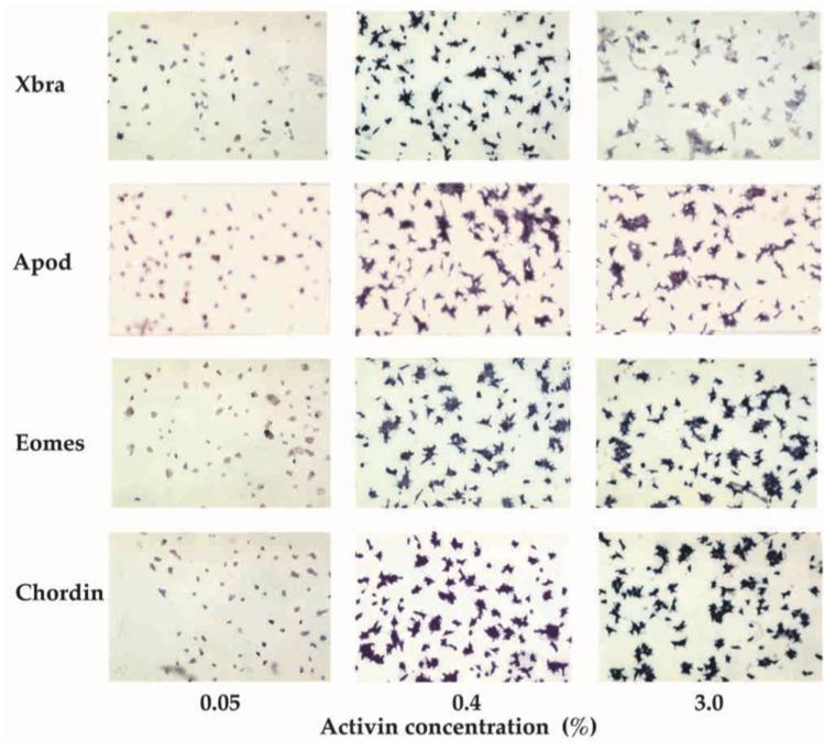 Fig. 5. Low-power views of in situ hybridization to low density cultures on fibronectin slides. There is a uniformity of gene expression among cells at each activin concentration, although these low magnification views do not reveal the more precise differences in staining intensity seen in Fig. 4, and quantitated in Fig. 6