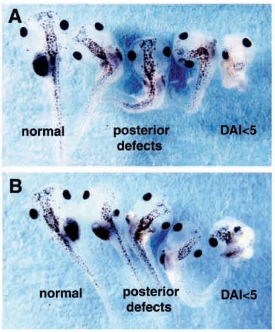 5 tadpoles resulting from injection of CA-ALK2 RNA in left (A) or