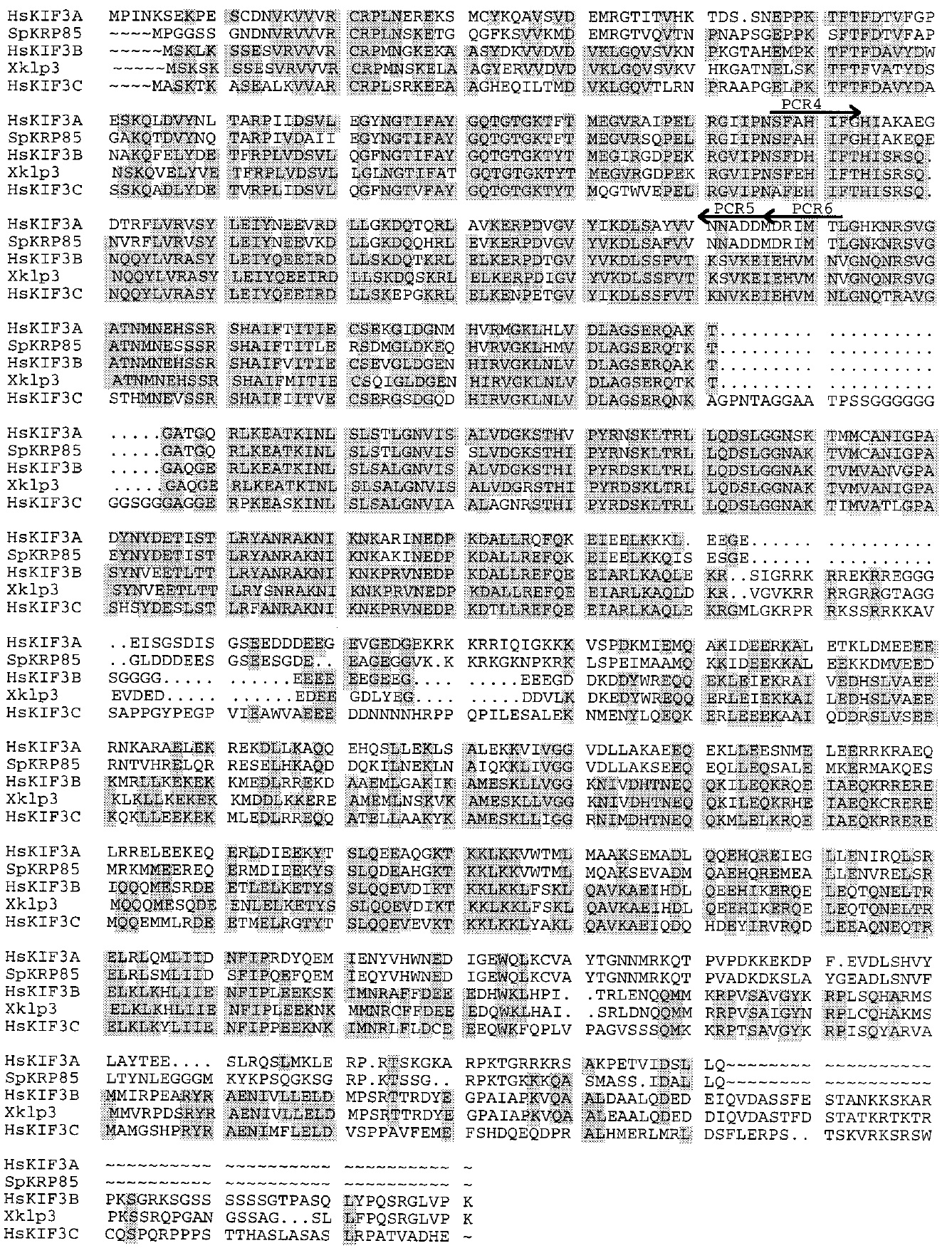 Fig. 1. Comparison of the human KIF3A amino acid sequence with other kinesin family members. PCR primers used to amplify
