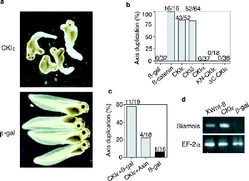 CKIÉ/δ induces a secondary axis in Xenopus embryos. (a) Examples of the embryos injected with CKIÉ or β-galactosidase (β-gal) RNA. (b) Percentage of embryos with duplicated axis injected with β-gal, β-catenin, CKIÉ, CKIδ, CKIα, KN-CKIÉ, or δC-CKIÉ RNA as indicated. The number of the embryos with duplicated axis relative to the total number of injected embryos is indicated above each bar. (c) Axin inhibits secondary axis formation induced by CKIÉ. CKIÉ RNA was coinjected with β-gal or axin RNA (1â2 ng). (d) Induction of Siamois by CKIÉ. Siamois expression was analyzed by RT-PCR from dorsal halves of the embryos injected with XWnt-8, CKIÉ, or β-gal. EF-1 expression was a loading control.