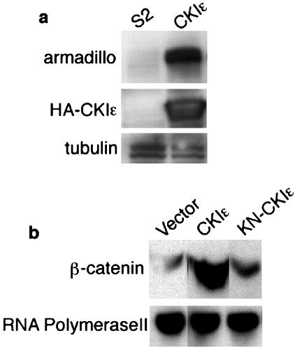 β-catenin stabilization induced by CKIÉ. (a) Drosophila S2 Schneider cell lysates blotted with armadillo antibody and hemagglutinin (HA) antibody recognized transfected CKIÉ. Tubulin was a loading control. (b) Cytosolic fraction from 293 cells transfected with vector, Wnt-1, CKIÉ, and KN-CKIÉ blotted with β-catenin antibody. RNA polymerase II was a loading control.