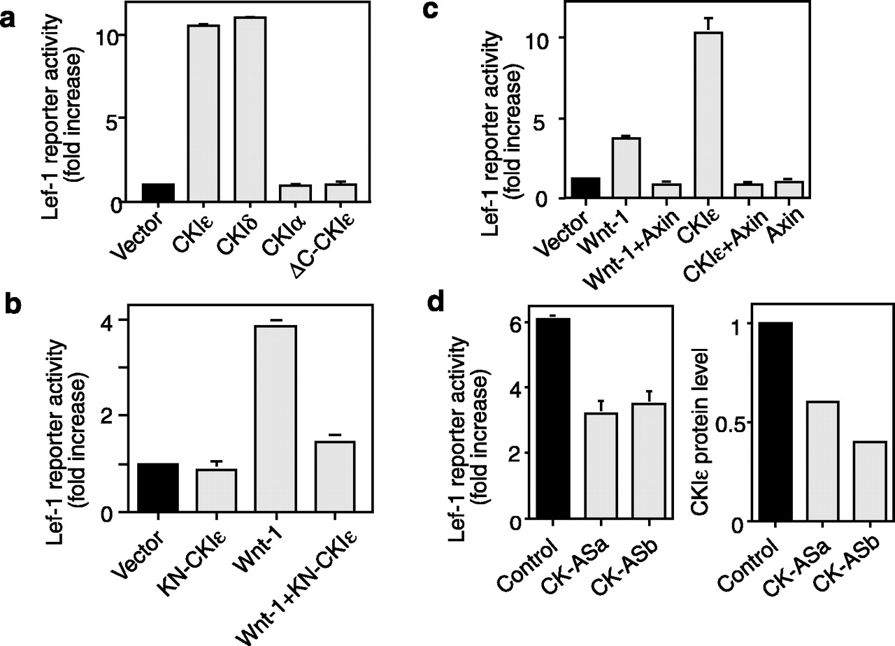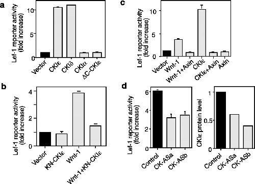 Lef-1 reporter gene activity induced by CKIɛ. Lef-1 reporter gene assay was performed as described (10). Representative data from several independent experiments are shown. (a) The effects of CKI isoforms on Lef-1 activity. (b) Axin inhibits Lef-1 reporter gene activity induced by CKIɛ. (c) KN-CKIɛ blocks Lef-1 activity induced by Wnt-1. (d) CKIɛ antisense-oligonucleotides inhibit Lef-1 reporter gene activity induced by Wnt-1. (Left) Wnt-1 induced Lef-1 reporter activity. CKI-ASa and CKI-ASb are two different antisense-oligonucleotides from the human CKIɛ coding sequence. The control-oligonucleotide is the reverse sequence of ASa. (Right) Endogenous level of CKIɛ normalized to levels of 14-3-3 protein (loading control) after transfection of oligonucleotides.