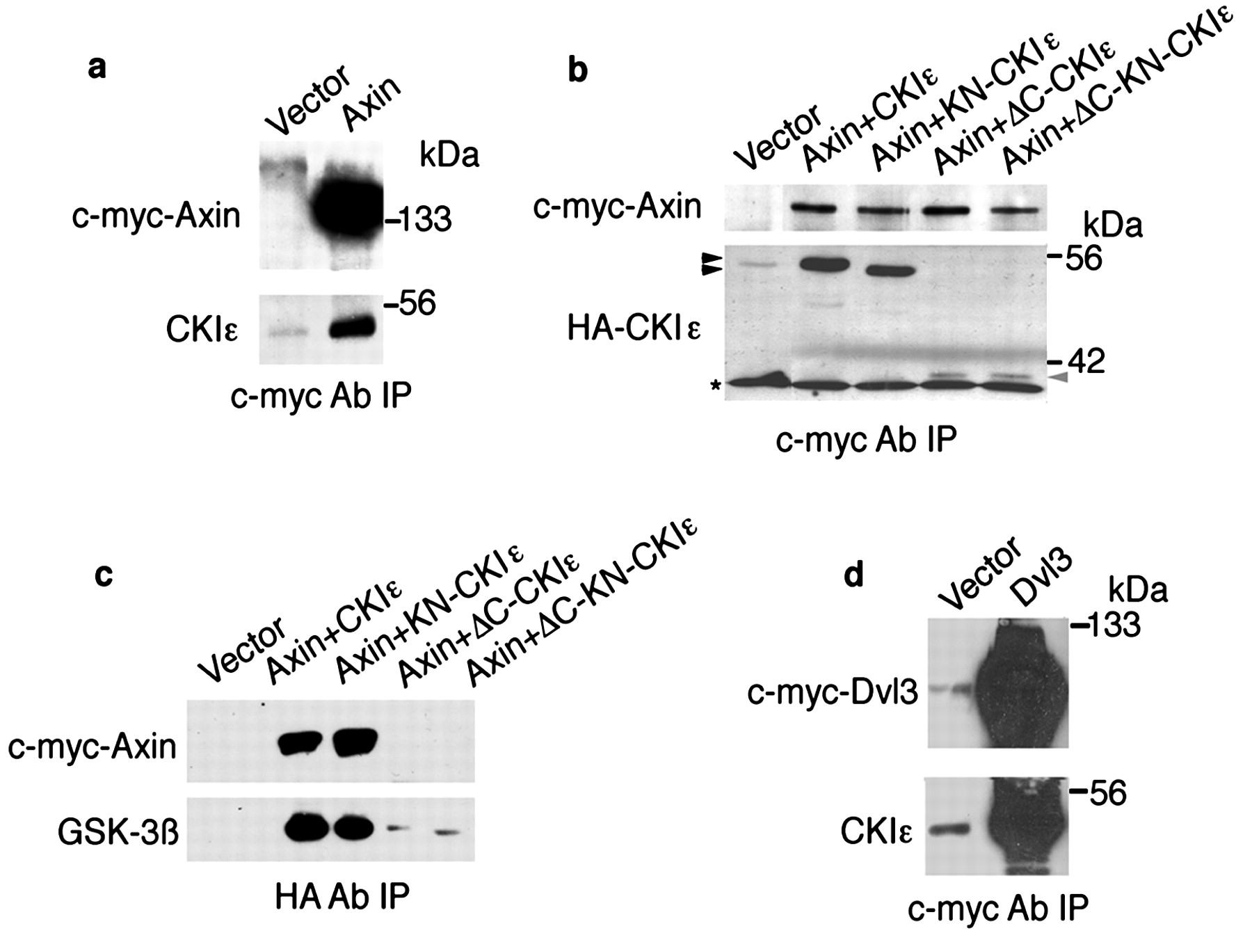 CKIɛ forms a complex with the other molecules in the Wnt pathway. (a) Endogenous CKIɛ coimmunoprecipitated with transfected myc-tagged axin. (b) The C-terminus domain of CKIɛ is required for binding to axin. Myc-axin and hemagglutinin (HA)-CKIɛ constructs (indicated by arrows) were cotransfected in 293 cells. Myc-axin immune complexes were analyzed by immunoblotting with myc (detect axin) and HA (detect CKIɛ) antibodies. Dye front was marked as ★. (c) GSK-3β is in a complex with CKIɛ and axin. Myc-axin and HA-CKIɛ constructs (indicated) were cotransfected in 293 cells. HA-CKIɛ immune complexes were analyzed by immunoblotting with myc (detect axin) and GSK-3β antibodies. (d) Endogenous CKIɛ is coimmunoprecipitated with transfected myc-tagged Dvl3.