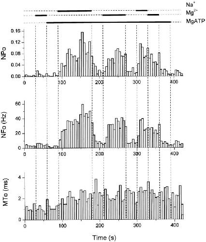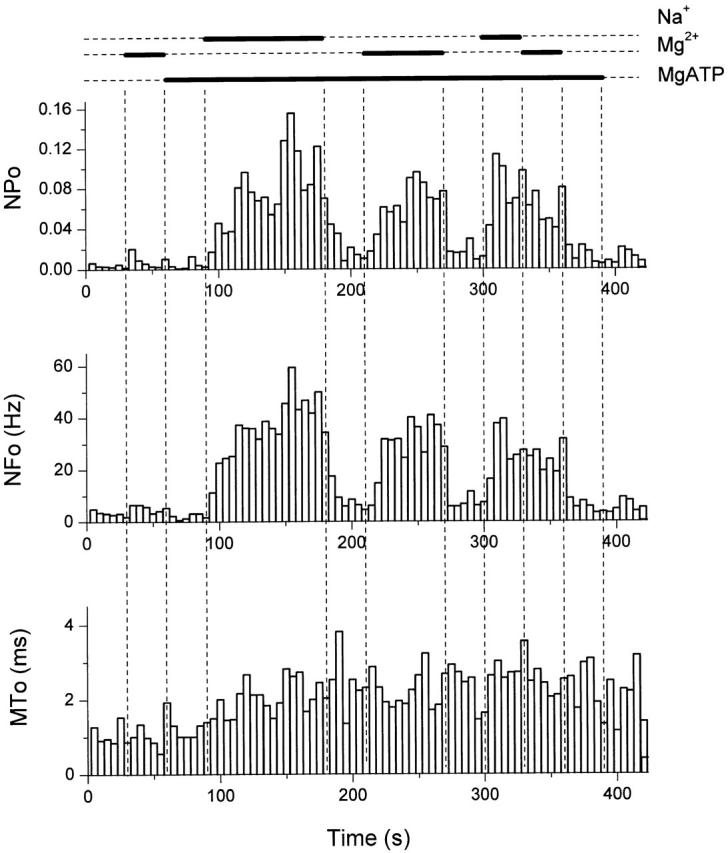 Figure 3. Mg2+ ions gate the ATP-modified GIRK channels. NPo, NFo, and MTo plots (bin = 5 s) of GIRK channel activity in an inside-out patch excised from an oocyte expressing GIRK1/GIRK4. 10 mM Mg2+, 2.5 mM MgATP, and 20 mM Na+ were applied via the bath as indicated by the bars. The membrane was clamped at −80 mV and 5 μM acetylcholine was present in the pipette. NPo, NFo, and MTo in 10 mM Mg2+ were calculated such that the amplitude levels were set to match the reduced amplitude of the channel openings in 10 mM Mg2+.