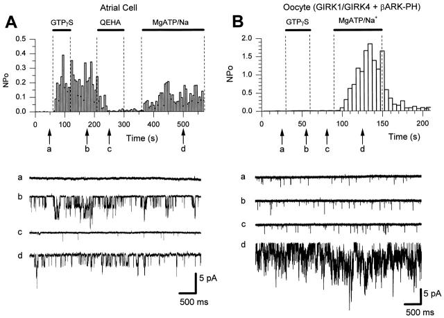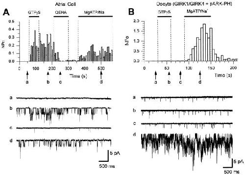 Figure 1. Impairment of G protein signaling does not affect the activation of KACh by MgATP and Na+. (A) Single channel activity (top; NPo, bin = 5 s) plotted as a function of time. The data were obtained from an inside-out patch excised from an atrial cell. The KACh channel was stimulated by maintaining the membrane at −80 mV and by the presence of 5 μM acetylcholine in the pipette. 10 μM GTPγS, 50 μM QEHA, and 5/20 mM MgATP/Na+ were applied for the duration indicated by the bars. Sample single-channel currents in each condition at the time marked by the arrows are shown under the plot (bottom). (B) NPo plot of KACh channel activity (top, bin = 5 s) in an inside-out patch from an oocyte expressing the human GIRK1/GIRK4 and the construct βARK-PH. The membrane was clamped at −80 mV and 5 μM acetylcholine was present in the pipette. Application of 10 μM GTPγS and 5/20 mM MgATP/Na+ are illustrated by the bars. Labeled arrows correspond to the sample single-channel currents shown under the plot (bottom).