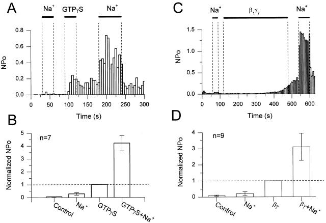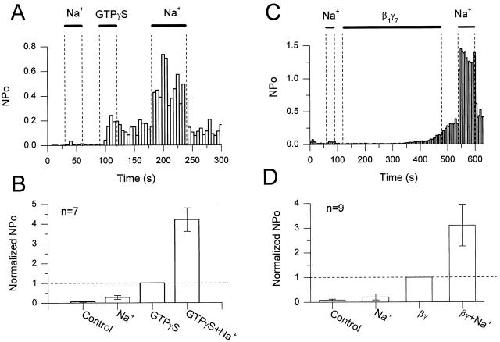 Figure 2. Na+ ions gate GIRK channels after activation by G protein βγ subunits. (A) Single-channel activity (NPo, bin = 5 s) plotted as a function of time. The data were obtained from an inside-out patch excised from an oocyte expressing the recombinant channel GIRK1/GIRK4. 20 mM Na+ and 10 μM GTPγS were applied as indicated by the bars. The membrane was clamped at −80 mV and 5 μM acetylcholine was in the pipette solution. (B) The mean NPo for seven patches is plotted for different conditions. Steady state channel activity after activation by GTPγS was taken as reference (GTPγS) and NPo were normalized to it. Na+ concentration was 20 mM and GTPγS was 10 μM. GTPγS+Na+ corresponds to the application of 20 mM Na+ after the washout of the GTP analogue. SEM are indicated by the vertical bars. The normalized mean NPo was 0.057 ± 0.018 (mean ± SEM) in control solution, 0.277 ± 0.095 in the presence of 20 mM Na+ ions, 1 after the application of 10 μM GTPγS, and 4.21 ± 0.59 in the presence of 20 mM Na+ ions after channel activation by GTPγS. (C) NPo vs. time plot for the channel activity recorded in an inside-out patch from an oocyte expressing GIRK1/GIRK4. 20 mM Na+ and 20 nM β1γ7 purified subunits were applied via the bath as indicated by the bars. Vm = −80 mV. 5 μM acetylcholine was present in the pipette. (D) The mean NPo for nine patches are plotted for different conditions. Steady state channel activity after β1γ7 activation (after β1γ7 washout) was taken as reference and NPo was normalized to it. Na+ concentration was 20 mM and β1γ7 was 20 nM. βγ+Na+ refers to the application of 20 mM Na+ after the washout of βγ. The vertical bars represent SEM. The normalized mean NPo was 0.084 ± 0.039 (mean ± SEM) in control solution, 0.206 ± 0.12 in the presence of 20 mM Na+ ions, 1 after the application of 20 nM β1γ7, and 3.1 ± 0.84 in the presence of 20 mM Na+ ions after activation of the channel by the G protein subunits.
