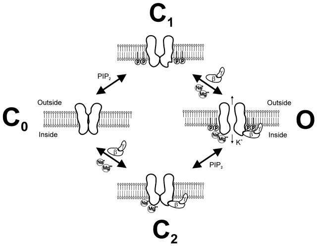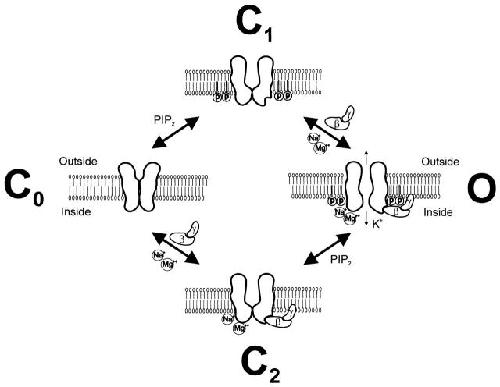 Figure 8. A model depicting gating of GIRK channels by the combination of PIP2 with gating molecules Gβγ and/or Na+ and Mg2+ ions. (Co) Channel closed state, in the absence of PIP2 in the plasma membrane and gating molecules. (C1) Channel closed state, in the presence of PIP2 in the membrane GIRK channels experience weak interactions that in the absence of gating molecules are not of sufficient strength to gate the channel. (C2) Channel closed state, gating molecules can interact with the channel at distinct sites but in the absence of PIP2 they fail to gate the channel. (O) Channel open state, gating molecules in the presence of membrane PIP2 can activate the channel and show synergism.
