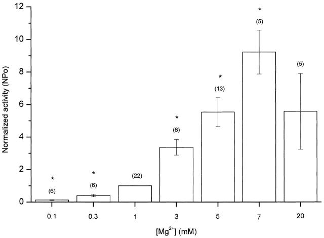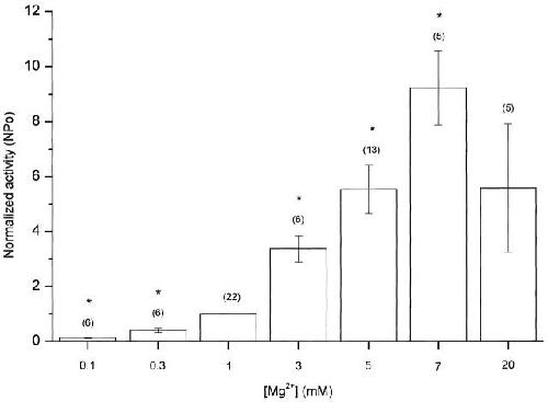 Figure 4. Concentration dependence of GIRK channel activation on internal Mg2+ ions. Normalized activity (NPo) of GIRK1/GIRK4 channels is plotted for different Mg2+ concentrations. Inside-out patches were exposed to 2.5 μM PIP2 before and during application of Mg2+. Responses were expressed in fold increase above the activity in the presence of PIP2 and were normalized to those recorded in the presence of 1 mM Mg2+. Vertical bars represent SEM. The responses obtained at the low concentrations of Mg2+ tested (<1 mM) were significantly higher than those with PIP2 alone (P < 0.05, paired t test). The holding potential was at −80 mV. 5 μM ACh was present in the pipette. *Significant differences from 1 mM Mg2+ (P < 0.01; paired t test).