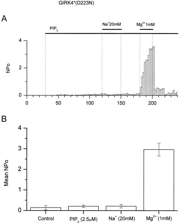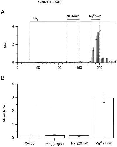 Figure 5. Mg2+ ions act at a site distinct of that used by Na+ ions. (A) Single channel activity (NPo, bin = 5 s) plotted as a function of time. An inside-out patch from an oocyte expressing GIRK4*(D223N) (see text) and human muscarinic receptor type 2 receptor was exposed to 2.5 μM PIP2 and 20 mM Na+ or 1 mM Mg2+ ions, and channel activity was recorded. The membrane potential was kept at −80 mV. The pipette solution contained 5 μM ACh. (B) Summary data plotting mean NPo of four experiments such as that shown in A. The mean NPo values were 0.14 ± 0.1 (mean ± SEM) in control conditions, 0.21 ± 0.06 in the presence of PIP2, 0.21 ± 0.08 in the presence of PIP2 and Na+ ions, and 2.97 ± 0.31 in the presence of PIP2 and Mg2+ ions.