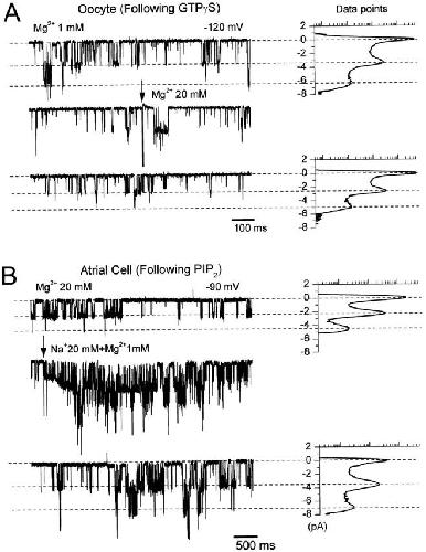 Figure 6. High concentrations of Mg2+ ions reduce the GIRK single-channel currents. (A) Single-channel records of GIRK channels in an inside-out patch excised from an oocyte expressing GIRK1/GIRK4. The membrane was clamped at −120 mV and 5 μM acetylcholine was present in the pipette. The channel was preactivated by 10 μM GTPγS and the current traces shown were recorded after washout of the GTP analogue. The switch between bath solutions containing 1 and 20 mM Mg2+ is visualized by the arrow (and by the corresponding electrical artifact on the record) on top of the second current trace. Associated all-point histogram plots indicate the amplitudes resulting from the various activity levels ranging from closed to multiple open levels and are shown for the first (1 mM Mg2+) and third (20 mM Mg2+) current traces. Data points are shown on a logarithmic scale ranging from 5 to 50,000. (B) KACh channel activity in an inside-out patch from a cardiac cell. The membrane was held at −90 mV and the pipette contained 5 μM acetylcholine. The patch was preincubated with 5 μM PIP2 and the current traces shown were recorded after the washout of PIP2. The arrow on top of the second current trace visualizes the switch between bath solutions containing 20 mM Mg2+ and 20 mM Na+ + 1 mM Mg2+. Associated all-point histogram plots are shown for the first (20 mM Mg2+) and third (20 mM Na+ + 1 mM Mg2+) current traces. Data points are shown on a logarithmic scale ranging from 20 to 50,000.