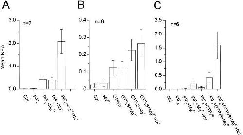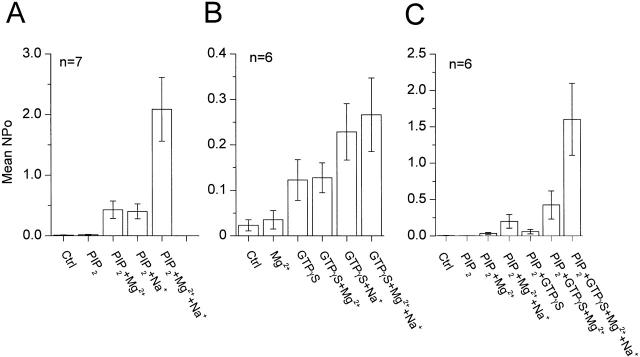 Figure 7. Synergistic effects of Gβγ, Na+, and Mg2+ ions in activating GIRK channels. (A) The mean NPo for seven patches are plotted for different conditions. The data were obtained from inside-out patches excised from oocytes expressing the recombinant channel GIRK1/GIRK4. The membrane was held at −80 mV and 5 μM acetylcholine was present in the pipette. PIP2 was 2.5 μM, Mg2+ was 10 mM, and Na+ was 10 mM. SEM are indicated by the vertical bars. The mean NPo for the channel activity was 0.011 ± 0.003 in control conditions, and 0.01 ± 0.006 during the application of 2.5 μM PIP2. When 10 mM Mg2+ ions were applied with PIP2, the mean NPo was 0.43 ± 0.14. 10 mM Na+ ions gave a mean NPo of 0.40 ± 0.12. When applied together, in the presence of PIP2, Mg2+ and Na+ ions (10 mM each) yielded a mean NPo of 2.08 ± 0.52. (B) Mean NPo plots for six inside-out patches from oocytes expressing GIRK1/GIRK4. Vm was −80 mV. 5 μM acetylcholine was in the pipette. Mg2+ was 10 mM, Na+ was 10 mM, and GTPγS was 10 μM. The columns GTPγS and GTPγS+x depict the channel activity measured after the GTP analogue was washed out and substance(s) x were added. SEM are indicated by vertical bars. The mean NPo of the channel was 0.023 ± 0.012 in control conditions and 0.035 ± 0.02 in the presence of 10 mM Mg2+ ions. 10 μM GTPγS gave a mean NPo of 0.12 ± 0.045. After GTPγS washout, Mg2+ ions gave a mean NPo of 0.12 ± 0.03. 10 mM Na+ ions gave a mean NPo of 0.23 ± 0.06. Coapplication of Mg2+ and Na+ ions resulted in a mean NPo of 0.26 ± 0.08. (C) Mean NPo plots for six patches. The inside-out patches were excised from oocytes expressing GIRK1/GIRK4. Vm was −80 mV. 5 μM ACh present in the pipette. PIP2 was 2.5 μM, Mg2+ was 10 mM, Na+ was 10 mM, and GTPγS was 10 μM. PIP2+GTPγS refers to the channel activity (at steady state) during the application of the GTP analogue. PIP2+GTPγS+x columns depict the channel activity measured after the washout of the GTP analogue and addition of substance(s) x. In absence of 10 mM Mg2+, all solutions contained 50 μM Mg2+. This low concentration of Mg2+ was necessary to render GTPγS effective. Vertical bars represent SEM. The mean NPo for the channel activity was 0.004 ± 0.002 in control conditions and 0.0007 ± 0.0002 in the presence of 2.5 μM PIP2. When 10 mM Mg2+ ions were applied to the patches in the presence of PIP2, a mean NPo of 0.034 ± 0.013 was obtained. Although this activity appeared small, it was significantly higher than that in PIP2 alone (P < 0.005, paired t test, log scale). 10 mM each of Mg2+ and Na+ ions in combination yielded a mean NPo of 0.2 ± 0.09. GTPγS gave a mean NPo of 0.058 ± 0.03. Again, although this activity appeared relatively small, it was significantly higher than that in PIP2 alone (P < 0.005, paired t test, log scale). When 10 mM Mg2+ ions were applied to the patches after the GTPγS treatment a mean NPo of 0.42 ± 0.19 was obtained. Mg2+ and Na+ ions applied together resulted in NPo of 1.6 ± 0.49.