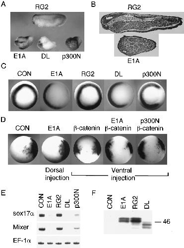 Figure 2. Inhibition of mesoderm, endoderm, and epidermis formation in animal pole explants. A, Inhibition of mesoderm markers induced by FGF examined at stage 10.5. WE is the positive control for RT-PCR, using the cDNA from whole embryos at the equivalent stage. RNA injected per embryo: 0.1 ng for E1A, RG, and DL; 3 ng for p300N. bFGF concentration is 50 ng/ml. B, Inhibition of mesoderm and endoderm markers induced by activin examined at stage 10.5. mix1 is a homeobox gene expressed in both mesoderm and endoderm. Endodermin induction by activin was examined at stage 35. The RNA amount that was injected is the same as in A. Activin concentration: 5 ng/ml (for mesoderm induction) and 50 ng/ml (for endoderm induction). C, Inhibition of early BMP-4 target genes induced by an activated ALK2, a BMP-4 receptor. RNA injected per embryo: 0.05 ng for E1A, RG, and DL; 3 ng for p300N; 0.2 ng for ALK2. D, A lack of inhibition of Xwnt-8 or b-catenin signaling. RNA injected per embryo is the same as in A, except 10 pg for Xwnt-8 and 0.1 ng for b-catenin. E, E1A or p300N inhibition of mesodermal and endodermal gene expression was rescued by p300(dl10), which has wildtype p300 function but is refractory to E1A inhibition (Eckner et al., 1994; Lee et al., 1996). RNA injected per embryo is the same as in A, except 1 ng for p300(dl10). |