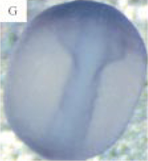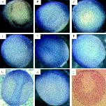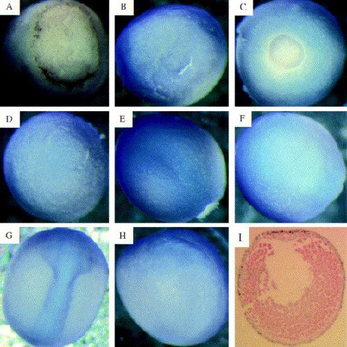 Fig. 1. Whole mount in situ analysis of the expression of Xlfc (blue/purple staining). (A,B) Stage 10 (early gastrula) embryos. (A) View of blastopore end, dorsal side lower most. (B) Lateral view, blastopore end to right. (C,D) Stage 12 (late gastrula) embryos. (C) View of blastopore end (posterior). Note even distribution of staining ventral and dorsal. (D) Anterior view. (E,F) Stage 14 (neurula) embryos. (E) Dorsal view, anterior top right; posterior bottom left. Note staining becoming concentrated in the dorsal (neural) ectoderm. (F) Ventral view. (G,H) Stage 18 (late neurula) stage. (G) Dorsal view, anterior top. Staining is now predominantly in the neural tube. (H) Lateral view, dorsal to right. (I) A 10-mm central transversal section through a late gastrula stage (12) albino embryo. The dorsal side is uppermost. Note that only the outer (ectodermal) cells are stained (brown). The section has been counter-stained red.