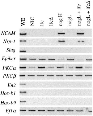 Fig. 3. Lfc increases the competence of ectodermal explants to respond to neural induction. RT-PCR analysis of caps taken from embryos injected with 500 pg lfc RNA, 500 pg lfcD RNA, 10 pg noggin RNA (nogL), 500 pg noggin RNA (nogH) or a combination, as shown. NIC, non-injected control. WE, whole embryos at the late neurula stage. ef1a is included as a loading control.