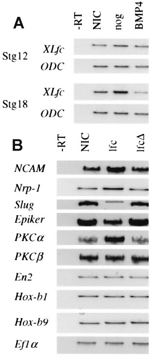 Fig. 2. (A) Xlfc expression is activated by ectopic noggin expression and repressed by ectopic BMP4 expression. Zygotes were injected with 500 pg of noggin or BMP4 RNA as shown. The expression of Xlfc in whole embryos was, subsequently, examined at the gastrula and neurula stages (12 and 18, respectively) by RT-PCR. ODC is included as a loading control. (B) Overexpression of lfc in whole embryos causes an expansion of the neural plate at the expense of the presumptive neural crest and epidermis. An RT-PCR analysis of RNA extracted from late neurula embryos injected with either lfc or lfcD as shown. NIC, non-injected control embryos. -RT, control without reverse transcription. ef1a is included as a loading control.