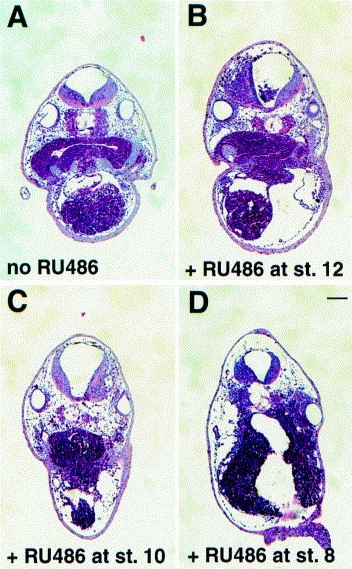 equatorially with CREBA133PR mRNA (750 pg each), and embryos were treated with 1 mM RU486 at the stages indicated and were cultured until stage 40.