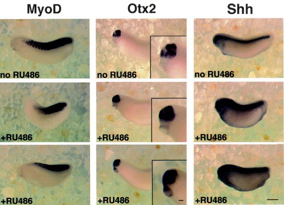 Fig. 6. Expression analyses of CREBA133PR injected embryos. Representative embryos are shown that were injected with RNA encoding CREBA133PR, treated with RU486 at stage 12, and used for whole mount in situ hybridization analyses at stage 30 to visualize the expression pattern of MyoD, Otx2 and Shh. Note that in CREBA133PR-injected and RU486-treated embryos the fore- and midbrain expression domains of Otx2 are not well separated from each other and that the MyoD expression domain in the somites is split and does not show the typical V-shaped form of normal somites. The expression of Shh has not changed. Injected embryos without RU486 treatment developed normally and did not show any changes in expression of MyoD, Otx2 and Shh. Scale bar: 500 mm; scale bar for insets: 100 mm.