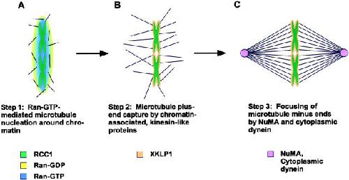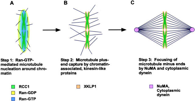 Figure 2. Three-step mechanism by which Ran-GTP initiates centrosome-free spindle assembly. (A) The high concentration of Ran-GTP produced by chromatin-bound RCC1 in the vicinity of chromatin stimulates microtubule assembly around chromosomes (see Carazo-Salas et al. 1999). (B) These randomly-oriented microtubules are then captured at their plus ends by chromosome-bound, microtubule-binding proteins (e.g., XKLP1). (C) Finally, the minus ends of microtubules are focused into poles by cytoplasmic dynein and its microtubule-cross-linking cargo NuMA.