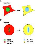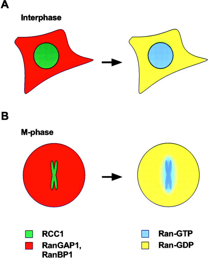 Figure 1. Localization of the Ran GAP and GEF leads to compartmentalization of Ran-GTP vs. Ran-GDP. (A) During interphase, nuclear localization of RCC1 (green) and cytoplasmic localization of RanGAP1 and RanBP1 (red) yield a distribution of Ran-GDP (yellow) in the cytoplasm and Ran-GTP (blue) in the nucleus. (B) During mitosis or meiosis, chromatin-associated RCC1 establishes a gradient of Ran-GTP that is concentrated at the surface of the chromosomes.