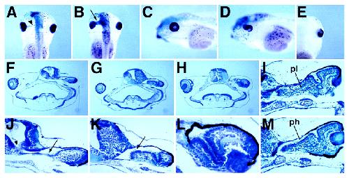 Effects of vax2 overexpression on swimming tadpole embryos after injection of 75 pg of Xenopus coding-region RNA and 250 pg of β-galactosidase RNA (B, D, FâH, and JâL) or 150 pg of full-length human RNA (E, I, and M) into the left dorsal animal blastomere at the 8 cell stage, as compared to the injection of 250 pg of β-galactosidase RNA alone (A and C). (A) A st. 46 embryo injected with β-galactosidase RNA, dorsal view. On the injected side (left), the optic cup and the forebrain are connected by the thin optic nerve only (arrowhead). (B) A st. 46 embryo coinjected with Xvax2 and β-galactosidase RNAs, dorsal view. The optic cup and the forebrain are abnormally connected by a giant optic stalk (arrow). (C) The same embryo shown in A, laterally viewed from the β-galactosidase-injected side. Eye morphogenesis is complete. (D) The same embryo shown in B, laterally viewed from the vax2-injected side. The optic fissure remains wide open. (E) Ventral view of the injected side of a st. 46 embryo microinjected with VAX2 RNA. The optic fissure is open. (FâH) Transversal sections of st. 46 embryos injected with Xvax2 RNA. (JâL) Higher magnifications of FâH, respectively. On the injected side, the right side in FâH, a wide optic stalk-like structure abnormally joins the optic cup to the brain (arrows in J and K). At anterior levels (F and J), a continuous lumen can be detected connecting the brainventricle and the eye (arrowhead in J). The defective invagination of the ventral optic cup is also evident (G, H, K, and L). (I and M) Transversal sections of a st. 46 embryo injected with VAX2 RNA showing that the aberrantly folded neural retina presents a plexiform layer (pl) and is dorsally covered by a photoreceptor layer (ph).