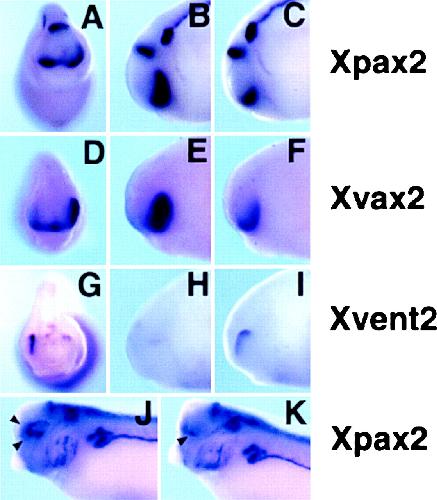 Expression of Xpax2 (AâC, J, and K), Xvax2 (DâF), and Xvent2 (GâI) genes in tail-bud (AâI) and tadpole (J and K) embryos injected with VAX2 RNA unilaterally. (A, D, and G) st. 23 injected embryos, frontal view. On the injected side (right), the Xpax2 and Xvax2 expression domains, normally confined to the ventral developing eye, are expanded dorsally (A and D), whereas the Xvent2 expression, which is dorsal in the control side, is strongly reduced (G). (B, E, and H) st. 23 injected embryos laterally viewed from the injected side. (C, F, and I) The same embryos shown in B, E, and H laterally viewed from the control side. (J and K) st. 33 injected embryos, laterally viewed from the injected (J) or the control (K) side. On the control side, Xpax2 expression in the optic cup is exclusively restricted to the lips of the optic fissure (arrowhead in K), whereas, on the injected side, Xpax2 expression expands both in ventral and anterodorsal regions of the eye cup (arrowheads in J).