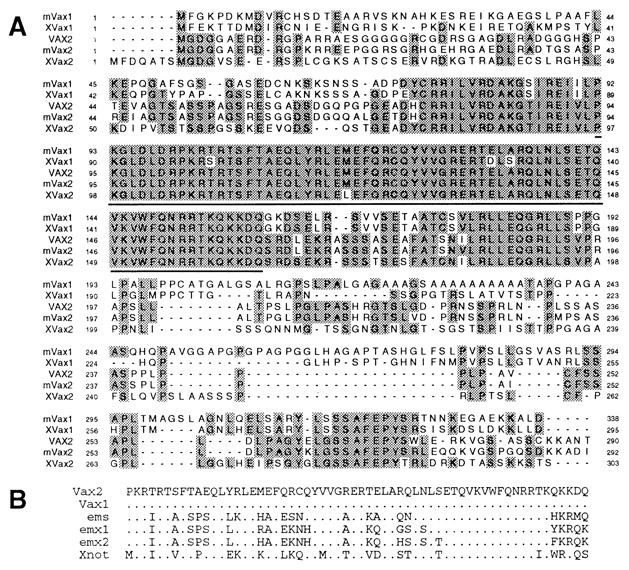 Sequence analysis of the vax2 cDNA. (A) Sequence alignment of the human VAX2 predicted protein with the mouse Vax2 protein (mVax2), the murine Vax1 protein (mVax1), and the Xenopus Vax1 and Vax2 proteins (XVax1 and XVax2, respectively). Amino acids that are identical in two or more proteins are shown in black. The homeodomain is underlined. (B) Amino acid sequence alignment of the VAX2 homeodomain and other related homeodomains. Residues identical to VAX2 protein are indicated by dots.