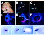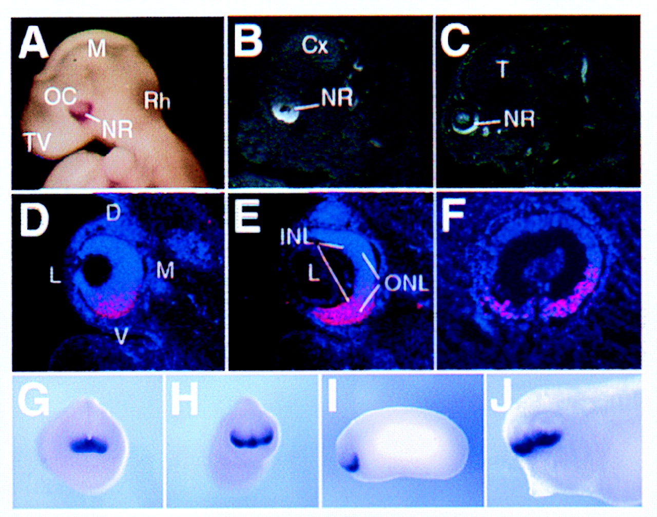 Expression pattern of vax2 in mouse (AâE), human (F), and Xenopus embryos (GâJ) as determined by in situ hybridization. Vax2 expression in mouse embryos is restricted to the entire inferior neural retina, starting from E9 (A), when it is expressed in the ventral half of the optic cup, to E12.5 (B) and E16.5 (C). Eye expression in mouse at E12.5 is shown in DâE. Panels are arranged from anterior (D) to posterior (E) in coronal sections. The axis orientation of the developing eye is indicated in D: dorsal (D), ventral (V), lateral (L), and medial (M). Expression is restricted to the entire inferior neural retina, with no significant difference between inner (INL) and outer (ONL) neuroblast layers in E. (F) Sagittal section of the developing eye of a 7-week-old human embryo hybridized with the human VAX2 cDNA showing a similar pattern of expression in the ventralretina. (GâJ) Whole-mount in situ hybridization showing expression of Xvax2 during Xenopus development. (G) st. 18, frontal view: the gene is expressed in the anterior neural plate. (H) st. 23, frontal view: Xvax2 is expressed in ventral regions of the forebrain vesicle and in a ventral portion of the optic vesicle. (I) st. 23, lateral view: expression as in H. (J) st. 33, lateral view: expression of Xvax2 is maintained in the ventral regions of both the telencephalon and diencephalon, as well as the retina. Other abbreviations: Cx, cerebral cortex; L, lens (except in D); M, mesencephalon (except in D); Rh, rhombencephalon; NR, neural retina; OC, optic cup; T, telencephalon; and TV, telencephalic vesicle.